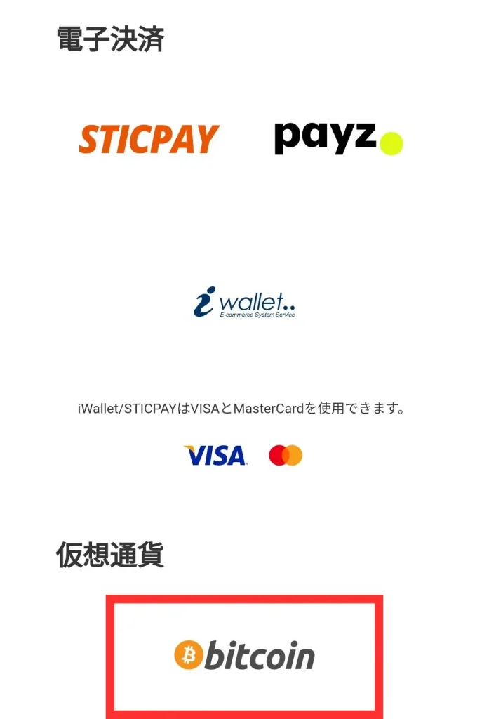 仮想通貨に対応しているブックメーカーであれば、入金方法の選択肢に仮想通貨があるため、それを選択しましょう。