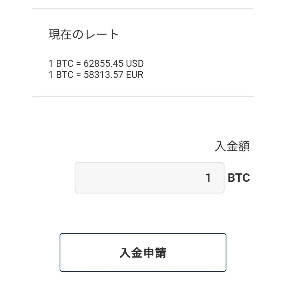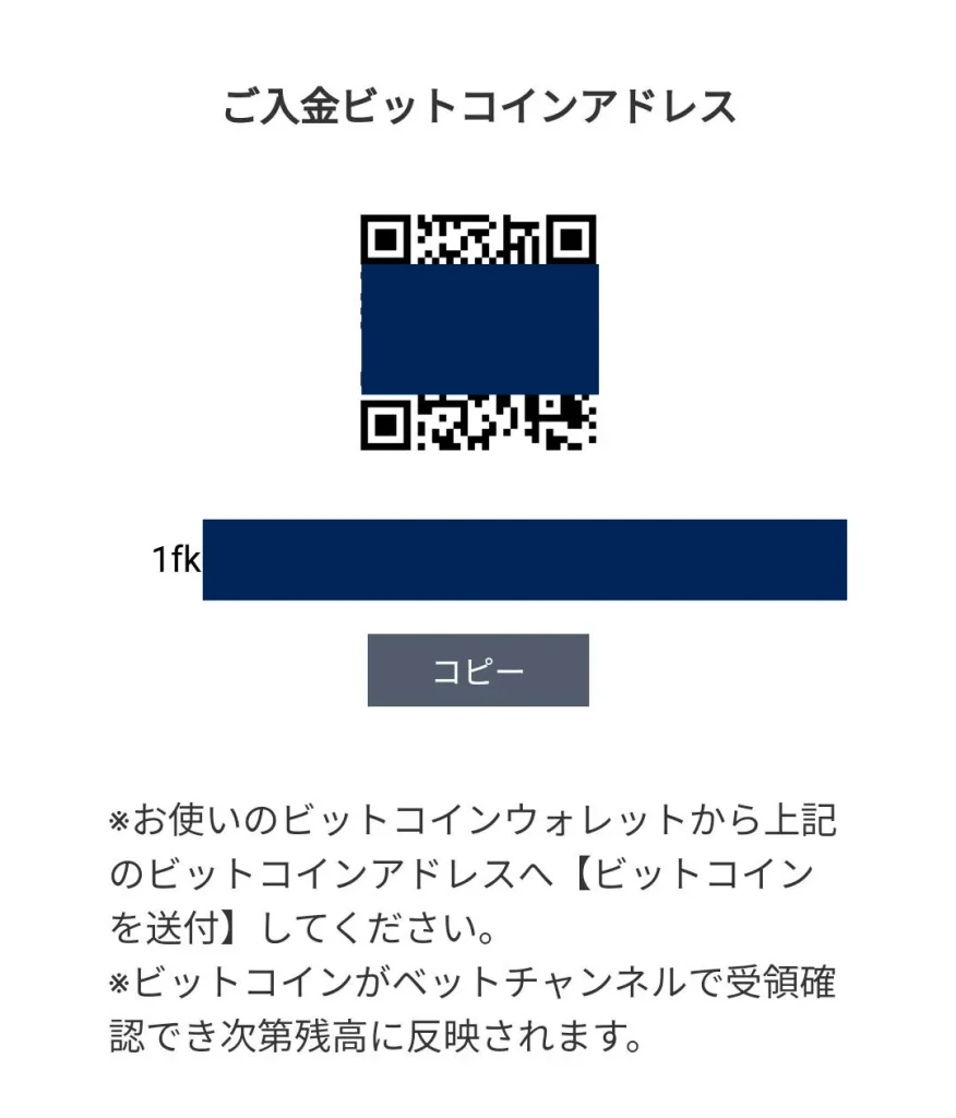 入金額を選択すると、ブックメーカーの送付アドレスが表示されます。その送付アドレスに対して自分の仮想通貨を送付することで入金が完了します。